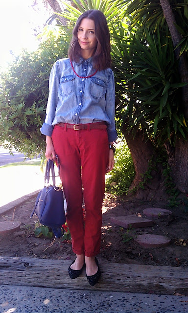 Поскольку сегодня мой день был напряженным, я хотела чувствовать себя комфортно. И именно для этого случая, я решила выгулять мои чиносы, джинсовую рубашку и остроносые туфли на плоской подошве. Я думаю, у меня получился вполне симпотичный повседневный образ для таких сумасшедших деньков, как этот.